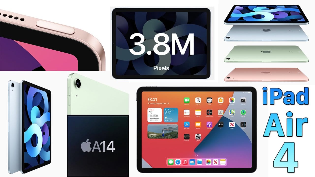 Ở mặt trước, iPad Air 4 đã có sự thay đổi lớn về thiết kế so với phiên bản tiền nhiệm. Apple đã loại bỏ nút home vật lý, tích hợp touch ID kèm với nút nguồn nằm ở phía trên. Đáng tiếc chiếc tablet này sẽ không còn mở khoá face ID, có lẽ là để tiết kiệm chi phí bởi vì linh kiện để mở khoá Face ID rất đắt đỏ. Đây cũng là lần đầu tiên iPad Air có tới 5 lựa chọn màu sắc trẻ trung, năng động bao gồm: bạc, xám đen, vàng hồng, xanh lá cây và xanh dương. Máy cũng tích hợp với bút Apple Pencil, bàn phím Magic Keyboard và các tính năng hỗ trợ thao tác công việc, học tập như một chiếc laptop cỡ nhỏ.