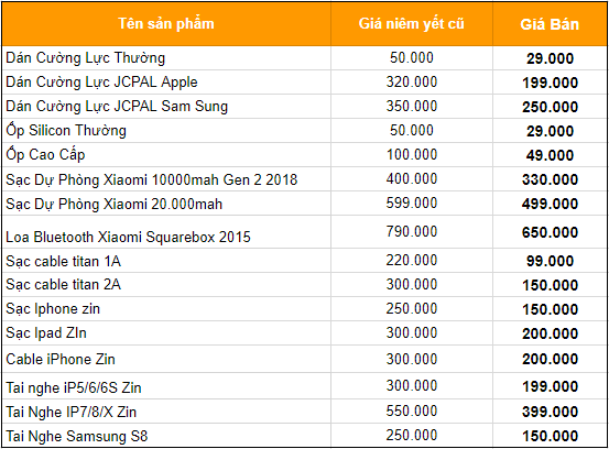 Cùng với những ưu đãi mua smartphone giá rẻ, Di Động Thông Minh còn giảm giá sâu nhiều mẫu phụ kiện cực hot. Chi tiết, mời các bạn tham khảo bảng giá phụ kiện dưới đây:
