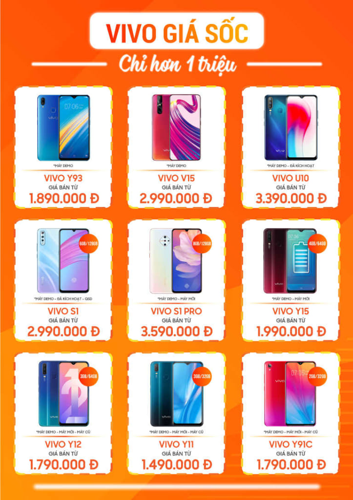 Các mẫu OPPO/REALME/Vivo số lượng có hạn, giá bán tùy tình trạng máy, chi tiết liên hệ hotline mua hàng miễn phí 1800.6501 hoặc truy cập báo giá: https://bit.ly/3ds66mZ