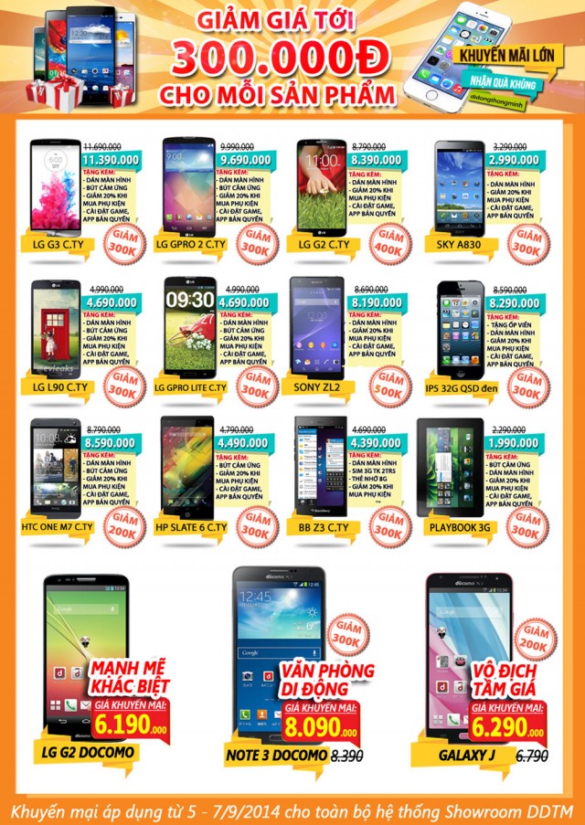 – Giảm từ 200-400.000đ cho các sản phẩm sau: LG G3, LG GPro 2, LG G2, LG L90, LG GPro Lite, HTC One M7, HP Slate 6, BackBerry Z3 và Playbook 3G
