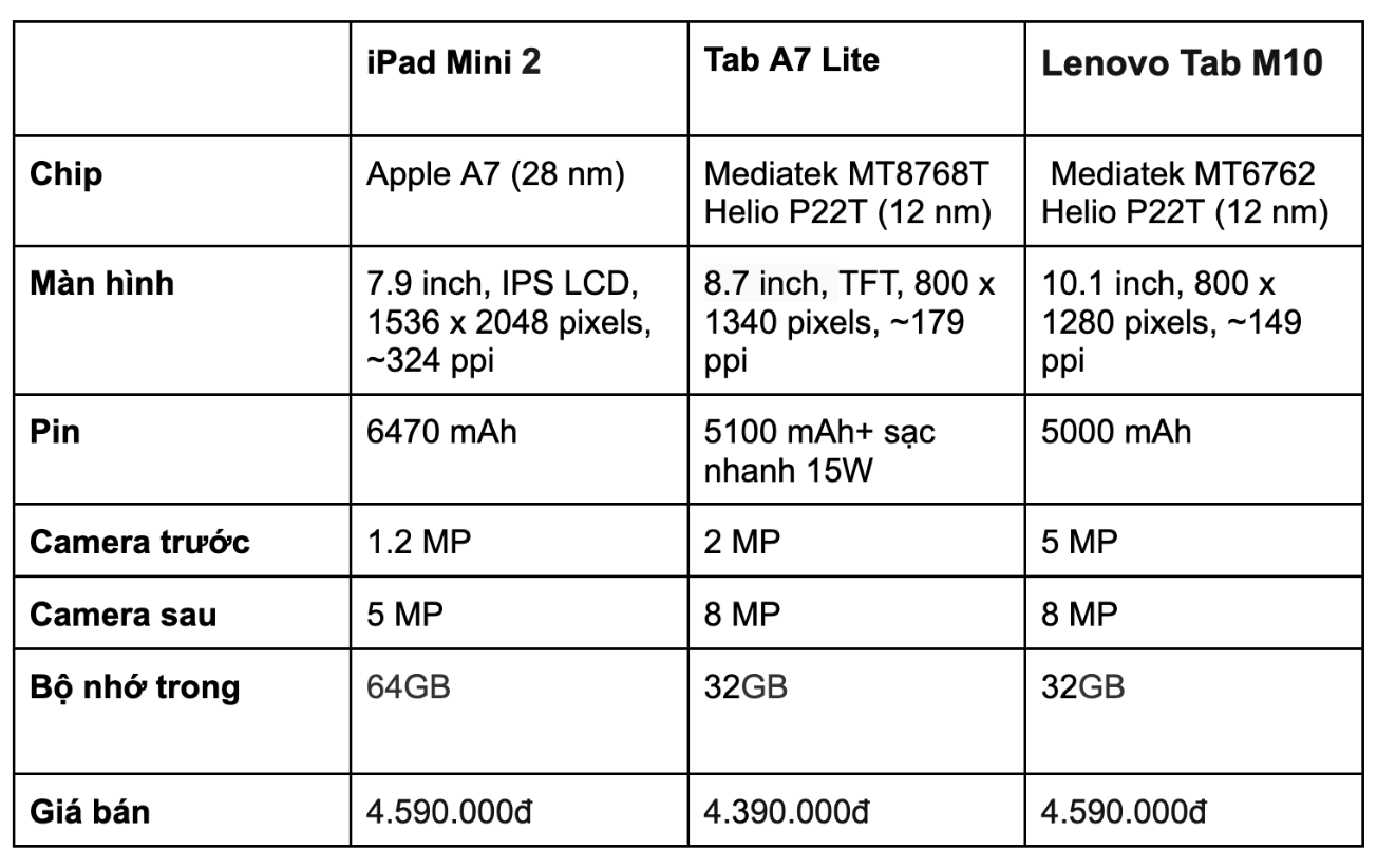 Dễ thấy rằng iPad Mini 2 mặc dù đã hơn 7 năm tuổi nhưng thời điểm hiện tại máy vẫn sở hữu màn hình độ phân giải cao vượt trội hơn hoàn toàn so với Tab A7 Lite và Lenovo Tab M10.