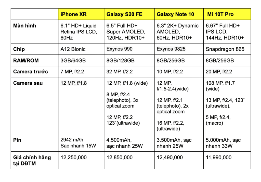 Trong cùng tầm giá 12 triệu ngoài iPhone Xr chúng ta cũng có nhiều sự lựa chọn khác từ các dòng smartphone Android như: Galaxy S20 FE, Galaxy Note 10, Xiaomi Mi 10T