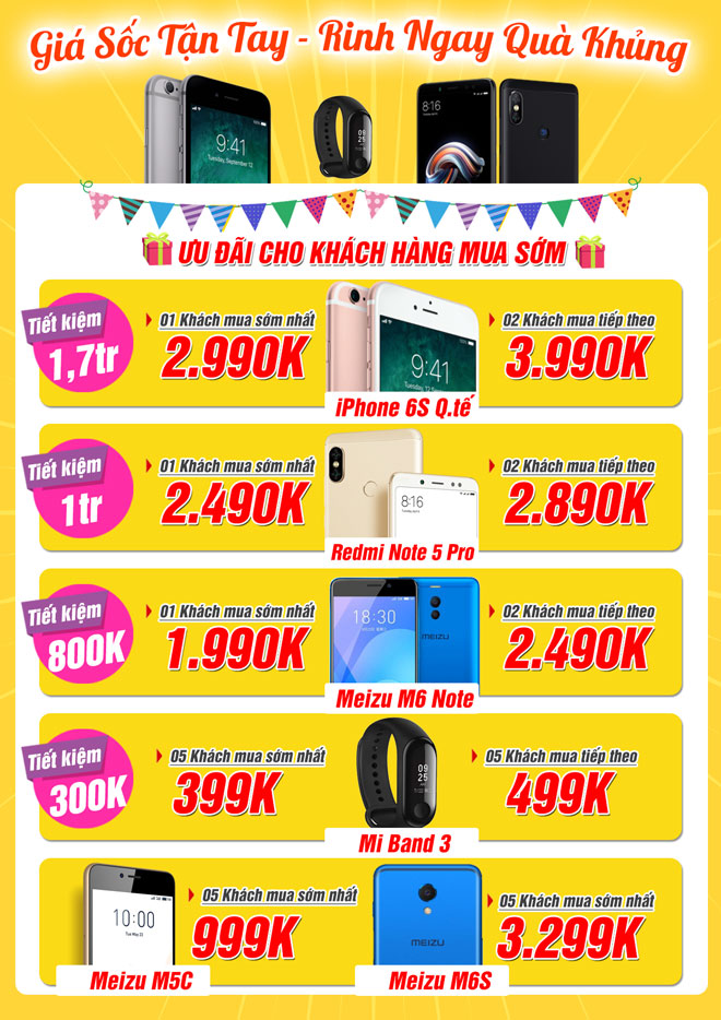 1. Siêu khuyến mãi bán không lãi – iPhone 6S giá 2.990K | Redmi Note 5 Pro giá 2.490K | Mi Band 3 giá 399K