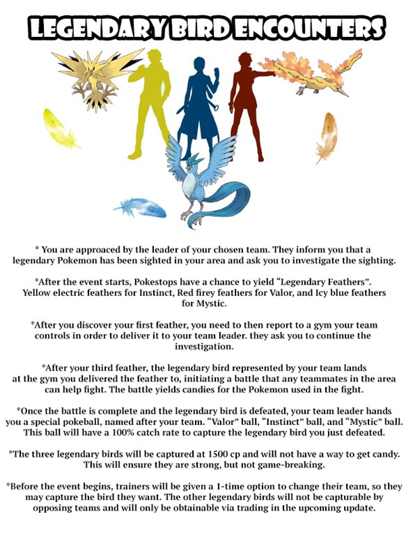 Trước khi sự kiện được diễn ra, tất cả Trainer sẽ có 1 cơ hội duy nhất để thay đổi nhóm của mình để bắt chú chim huyền thoại mà mình thích. Team màu xanh sẽ chỉ bắt được chim xanh Articuno và các team khác cũng tương tự như vậy.