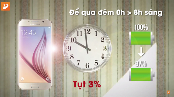 Tuy được trang bị viên pin với dung lượng không cao nhưng Samsung S6 đã tạo được ấn tượng với người dùng về công nghệ sạc nhanh siêu tốc của máy. Tiếp theo chúng ta sẽ kiểm tra thời gian chờ của chiếc Galaxy S6 này. Về thời gian chờ qua đêm thì sau 8 tiếng với việc lắp sim và tắt tất cả kết nối và ứng dụng chạy ẩn Galaxy S6 tụt 3% Pin, và với số liệu này chúng ta có thể tính toán tương đối, Samsung S6 sẽ cho thời gian chờ khoảng 11 ngày.