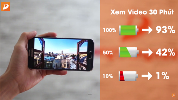 Đầu tiên, sẽ là bài test thời lượng xem video trực tuyến trên youtube. Với mức Pin đầu tiên 100%, sau khi xem xong trong 30p, ta thấy pin tụt 7% (còn 93%). Với mức Pin ở mức thứ 2 đạt 50% sau 30p Galaxy S6 còn 42% (đã giảm 8%). Và khi pin ở mức thứ 3 còn 10% thì phát video xong Samsung S6 chỉ còn duy nhất 1% đã tụt 9%. Như vậy tính trung bình thì với mức pin đầy 100%, Galaxy S6 có thể phát video trực tuyến liên tục trong 6h15p.