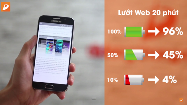 Tiếp theo là bài test về thời lượng lướt web, đọc báo trong 20p. Vẫn ở 3 mức Pin 100%, 50% và 10% sau khi kiểm xong ta đo được các kết quả % tiêu hao pin lần lượt là 4%, 5% và 6% Cũng tính như trên, thì trung bình Galaxy S6 có thể đọc báo lướt web liên tục trong 6h38p