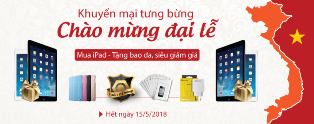 Cứ mỗi dịp 30/4 – Kỉ niệm Giải phóng miền nam, thống nhất 3 miền của đất nước. Niềm vui của cả dân tộc Việt Nam hân hoan trên khắp phố phường với kì nghỉ dài ngày kết hợp với Quốc Tế Lao Động 1-5 và ngày giỗ tổ hùng vương 10/3 âm lịch, Hòa chung niềm vui ấy, Di Động Thông Minh trân trọng gửi đến chương trình khuyến mãi lớn cho các sản phẩm iPad nhằm đem đến cho khách hàng thêm niềm vui mua sắm trong dịp này.