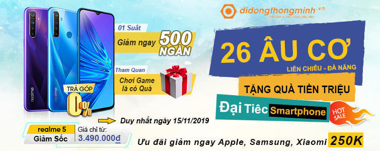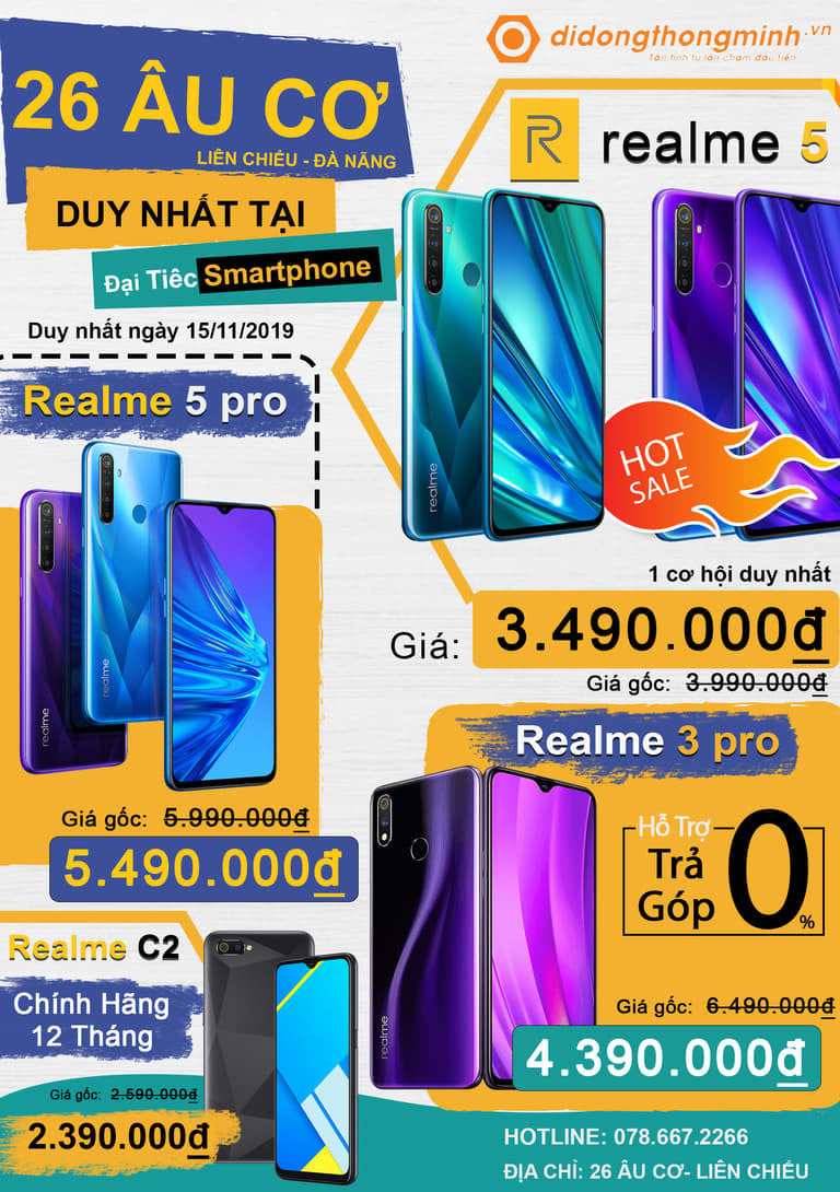Nhằm mục đích tri ân khách hàng đã tin tưởng và đồng hàng cùng Di Động Thông Minh 26 Âu Cơ trong suốt thời gian vừa qua. Với lợi thế là đơn vị chuyên phân phối các sản phẩm của Realme hàng đầu Việt Nam cùng mong muốn khách hàng có thể trải nghiệm và sở hữu những Smartphone Realme chính hãng giá rẻ nhất, tốt nhất. Di Động Thông Minh xin gửi tới chương trình “ Đại tiệc Smartphone , giảm ngay 500K – Tặng quà tiền triệu″ DUY NHẤT ngày 15/11 tại 26 Âu Cơ