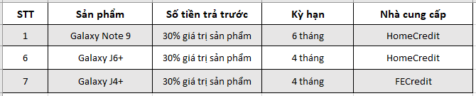 Bảng giá trả góp các smartphone Samsung chính hãng tại DDTM T1/2019