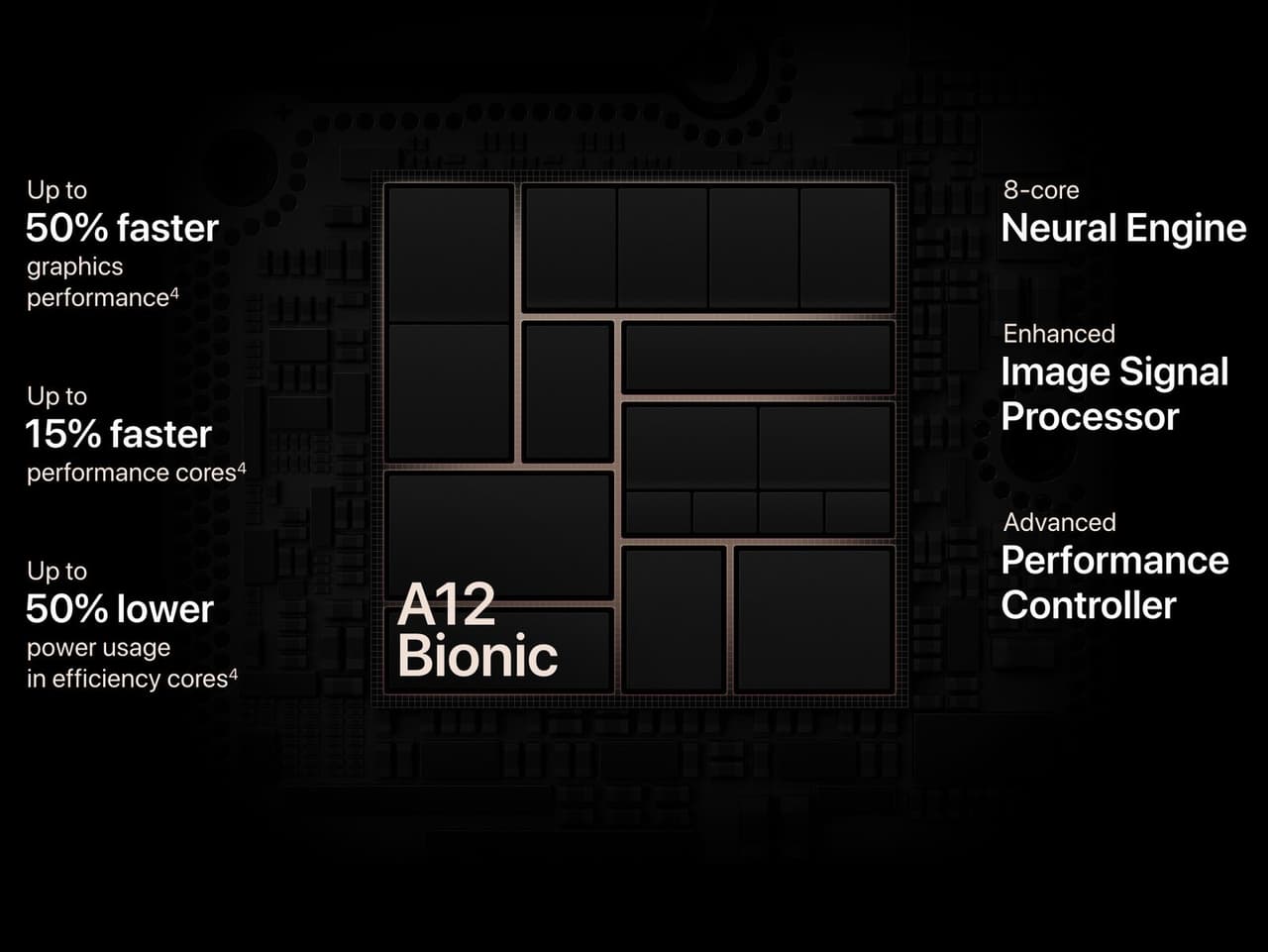 Cấu hình iPhone XS, XS Max tiếp tục được Apple nâng cấp lên A12 Bionic so với chip A11 đang có trên iPhone X. Cụ thể, hiệu năng của chip Apple A12 tăng thêm 15%, hiệu suất xử lý đồ họa tăng 50% đồng thời giảm 50% lượng điện năng tiêu thụ do được sản xuất trên tiến trình 7nm hoàn toàn mới.