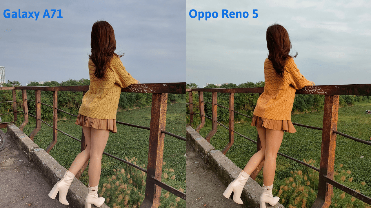 - So sánh nhanh giữa ảnh camera thường của 2 máy A71 và Reno5 thì mình thấy ảnh của A71 thiên về tone lạnh, màu sắc Reno5 vẫn sát với thực thế và thiên về tone ấm. Lúc này mình chụp là trời đã có nắng nên màu sắc lên rất đúng với thực tế chứ không u ám như hồi đầu chiều mình chụp ở chân cầu.