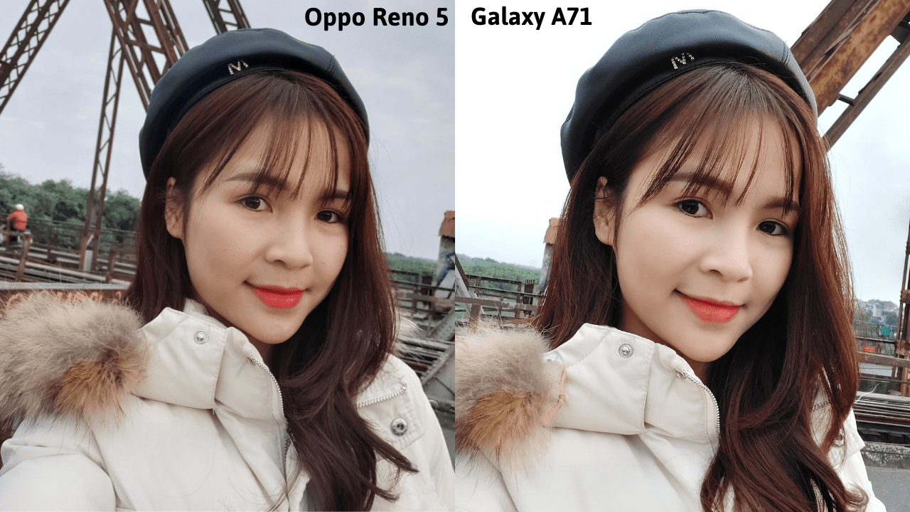 - Ở đây mình cũng đã chụp selfie với 2 máy, trên A71 thì da mặt của mình bị cà mịn rõ rệt, gần như không thế khuyết điểm, cân bằng trắng thiên về tone lạnh, trong khi những bức ảnh selfie từ Oppo reno 5 đã sát với thực tế hơn, những chi tiết trên khuôn mặt như nốt ruồi và nếp nhăn vẫn được giữ lại nhưng da của mình vẫn được chỉnh sang lên 1,2 tone.