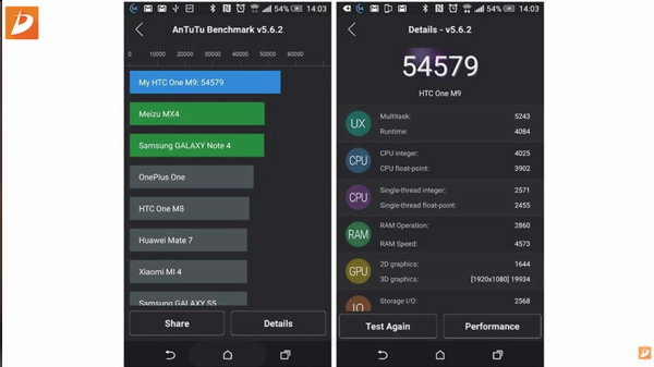 Với trình Benchmark phổ thông nhất là Antutu Benchmark, One M9 đạt được số điểm rất cao, khoảng hơn 50000đ, có khi lên tới gần 60.000đ, tuy nhiên vẫn thua kém chiếc Galaxy S6. Dù sao, với số điểm như thế này thì với quá trình sử dụng bình thường chắc chắn chúng ta cũng sẽ không nhận ra sự khác biệt được.