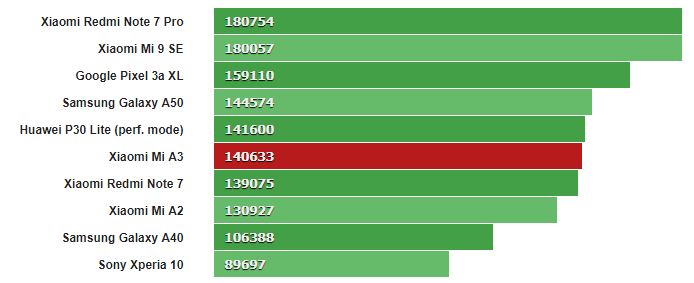 Điểm hiệu năng tổng quát AnTuTu của Xiaomi Mi A3 là 140.000 điểm, chỉ cao hơn những máy chạy Snapdragon 660 như Redmi Note 7 một chút ít. Tuy nhiên đây vẫn là một con số rất cao so với các đối thủ trong tầm giá. Dù sao điểm số ở các phần mềm chấm điểm luôn chỉ mang tính chất tham khảo và điều quan trọng ở đây là Mi A3 đã thể hiện rất tốt trong thực tế.