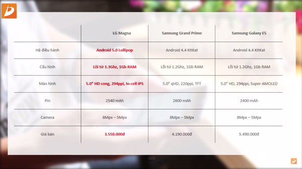 Nếu so sánh với một số sản phẩm khác thuộc phân khúc của máy thì Magna sở hữu khá nhiều điểm nổi trội. Trong hình ảnh dưới đây, chúng ta sẽ so sánh một số điểm chính thì LG Magna đã vượt mặt các sản phẩm khác ở khá nhiều mặt mà lại có một mức giá dễ chịu hơn.