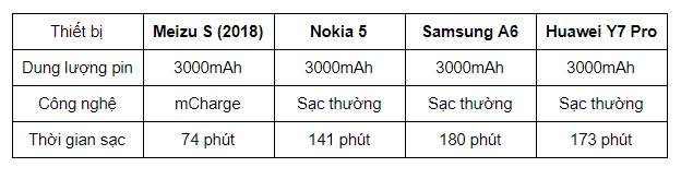 Đặt sản phẩm Meizu S (2018) để so sánh thời gian sạc pin với những sản phẩm trong cùng phân khúc dưới 4 triệu mà có dung lương pin là 3000mAh thì Meziu S có tốc độ sạc pin nhanh nhất
