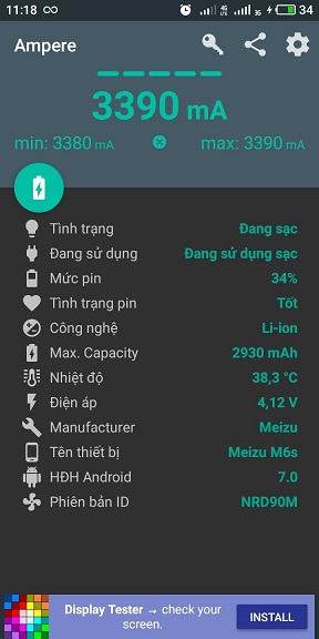Sử dụng App Ampera đo cường độ dòng điện vào máy thu được kết quả ấn tượng : nguồn vào đạt tối đa 3390mA