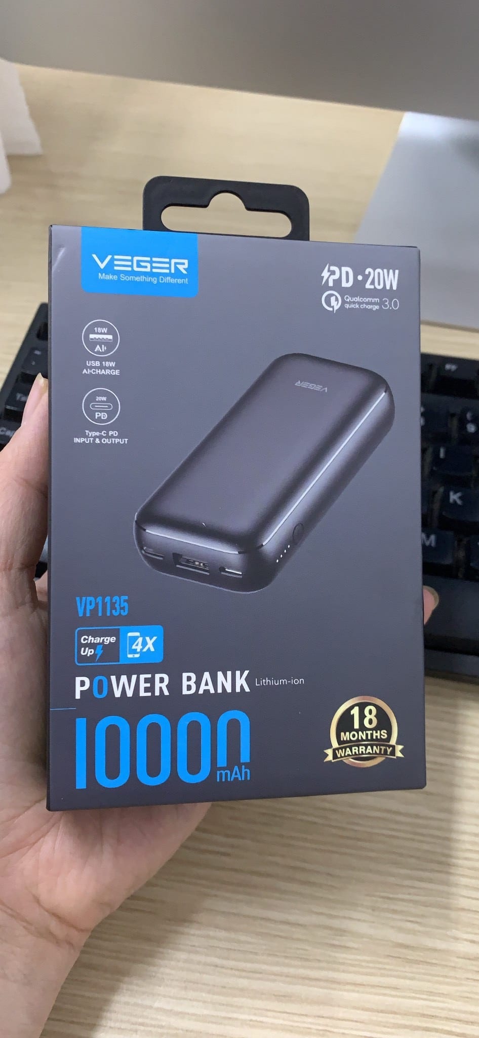Pin dự phòng Veger VP1135 chính hãng dung lượng 10.000mAh siêu nhỏ gọn, có sạc nhanh 2 chiều PD 20W cho iPhone và Qualcomm Quick Charge 3.0 cho Smartphone. Bảo hành 1 đổi 1 trong 18 tháng.