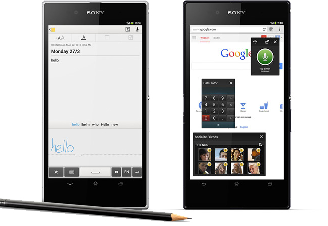 Một điểm ấn tượng nữa chính là màn hình cảm ứng điện dung của Xperia Z Ultra SOL24 hỗ trợ 10 điểm cảm ứng và đặc biệt là có khả năng tương tác với cả bút, hỗ trợ viết trực tiếp trên màn hình, không chỉ bằng cây viết S Pen như của Samsung, mà người dùng có thể sử dụng bất kỳ loại viết chì, bút bi hoặc thậm chí một đồng xu để tương tác với màn hình. Vì vậy, chúng ta có thể dễ dàng thao tác, phác thảo, vẽ biểu đồ, viết note, lập kế hoạch hoặc soạn thư và tin nhắn bằng chữ viết tay một cách hết sức đơn giản.