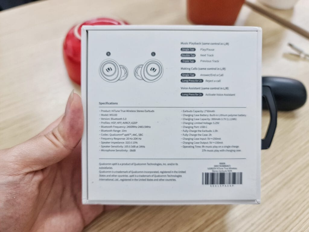 Về mặt công nghệ, Ugreen đã rất cẩn thận in chi tiết ở phía mặt sau hộp cho chúng ta rồi. Mẫu tai nghe này có Bluetooh 5.0, chip giải mã âm thanh Qualcomm aptX, AAC, SBC.