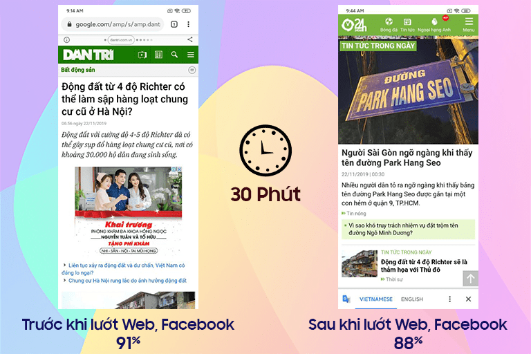 Trải nghiệm lướt web trên Mi CC9 Pro trong thời gian 30 phút, độ sáng 50%, pin tụt 3%