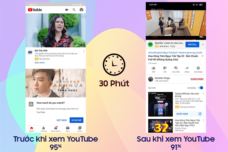 Trải nghiệm xem youtube trên Mi CC9 Pro trong 30 phút, độ sáng 50%, âm lượng 40%, pin tụt 4%