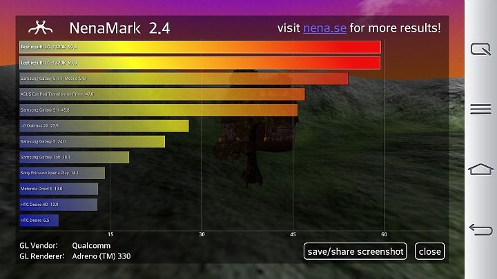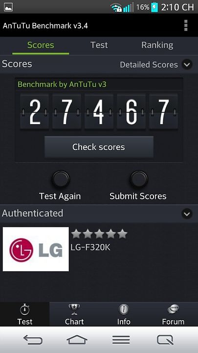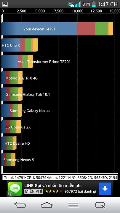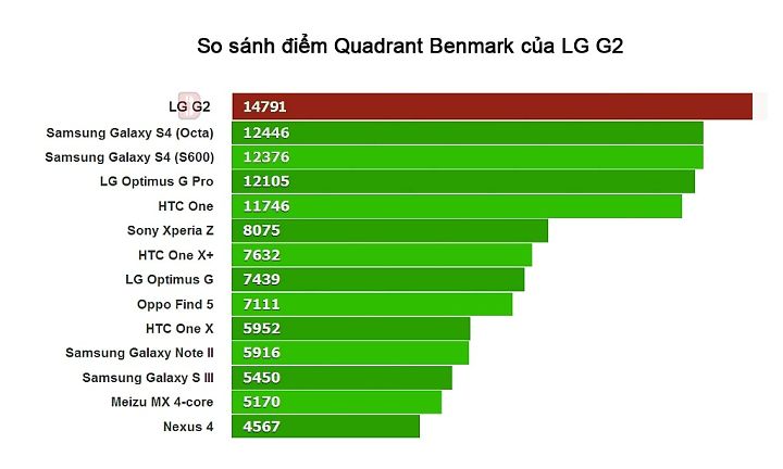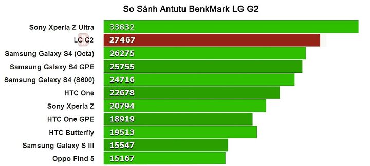 Trong cùng phân khúc với G2 chúng ta có thể thêm Galaxy S4 và Ultra Z bởi chúng đều sở hữu cấu hình khủng nhất với bộ vi xử lý S800. Mời các bạn cùng tham khảo điểm số benmark của thiết bị này ở phía trên. Mọi bài test G2 đều đạt số điểm nằm trên TOP đầu bảng xếp hạng Smartphone hiện nay. Từ điểm số so sánh này chúng ta có thể thấy LG G2 chỉ thua duy nhất Xperia Z Ultra của Sony ở thời điểm hiện tại
