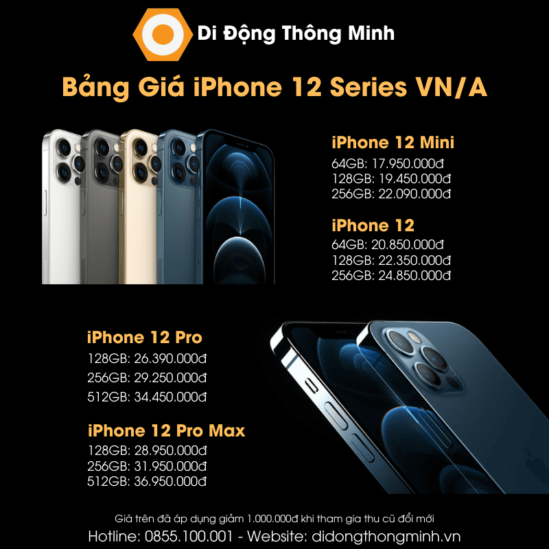 Giá bán iPhone 12 tại hệ thống của Di Động Thông Minh gần như rẻ nhất thị trường, cụ thể iPhone 12 mini chính hãng 64GB chỉ 18.950.000đ trong khi giá niêm yết tại hãng gần 22 triệu. iPhone 12 Pro Max chỉ 29.950.000đ bằng với giá bán iPhone 12 Pro xách tay. Vậy tội gì chúng ta phải mua hàng xách tay vừa đắt đỏ, thời gian về sớm hơn cũng không đáng kể. Thay vào đó, hãy là 1 người mua hàng thông thái, lựa chọn iPhone 12 chính hãng bạn vừa được mức giá tốt hơn và vừa được bảo hành yên tâm tại Apple Store tại Việt Nam.