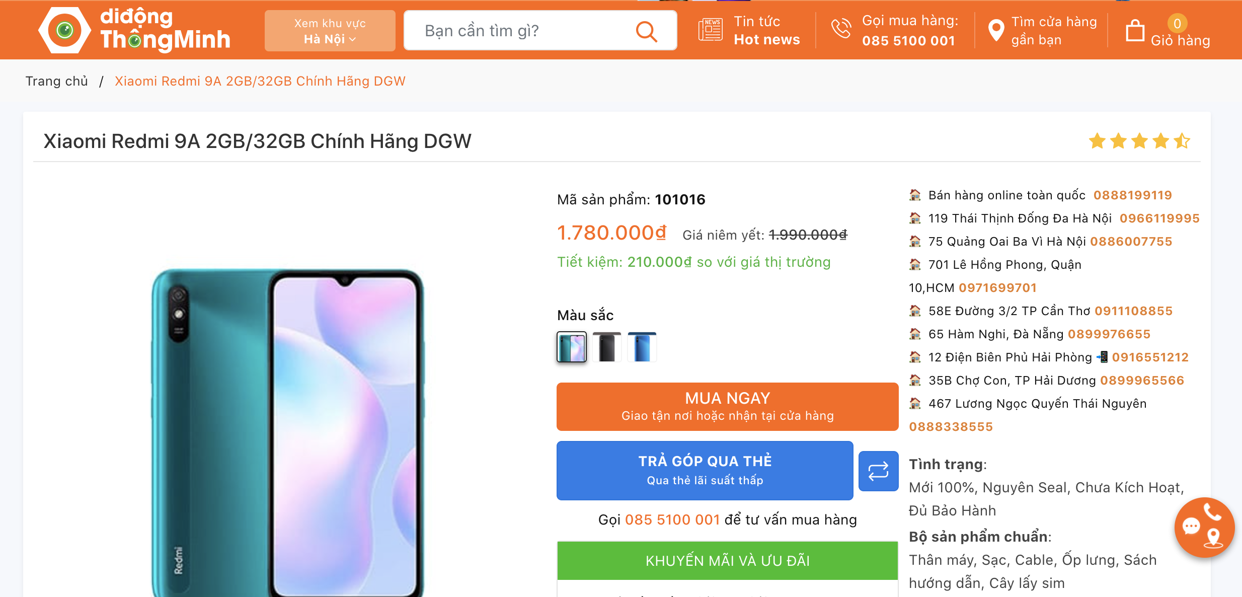 Hiện tại, Redmi 9A đang có ưu đãi lớn giảm trực tiếp 210.000đ chỉ còn 1.780.000đ cho phiên bản Ram 3/32 GB. Đây là phiên bản chính hãng nên có sẵn Tiếng Việt kèm bảo hành chính hãng 18 tháng.