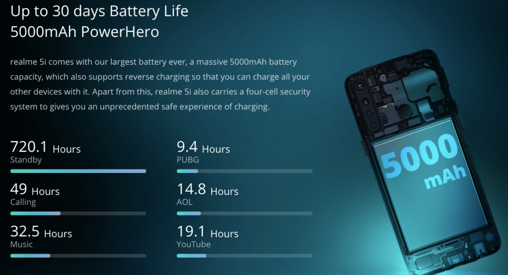 Thứ 3, Realme 5i mang viên pin lớn với dung lượng lên đến 5.000mAh. Trong phân khúc điện thoại giá rẻ, dung lượng pin lớn sẽ rất quan trọng bởi không phải lúc nào chúng ta cũng có thể đem theo sạc bên người, nhất là những bạn học sinh, sinh viên còn đi học. Dù vậy, việc chỉ được trang bị sạc 10W cũng là một điểm yếu nho nhỏ trên Realme 5i mà các bạn cần lưu ý.