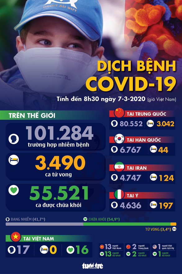 Theo cập nhật của báo Tuổi trẻ, tính đến sáng 7/3/2020, số ca mắc Covid-19 trên toàn thế giới đã vượt mốc 100.000 người. Nhìn vào số liệu này mới thấy sự nguy hiểm của đại dịch Covid-19 gây ra trên toàn thế giới. Trong đó, hiện Việt Nam đã có 17 ca nhiễm, phục hồi 16 ca và hiện chỉ còn một ca nhiễm mới phát hiện vào tối 6/3 tại Hà Nội.