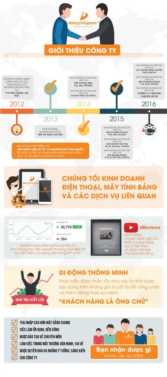 - Khi làm việc tại Di Động Thông Minh, bạn không chỉ được phát triển về chuyên môn, mà còn được khai mở nhân sinh quan, được xây dựng lộ trình phát triển trong công việc, tạo cơ hội cho những nhân tài và tạo con đường làm việc bền vững cho các nhân viên trung thành. Đến với Di động Thông minh là đến với một môi trường lao động năng động, sáng tạo, hài hòa và bền vững