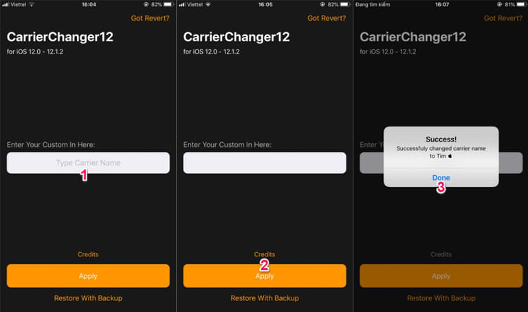Mở CarriesChanger12 từ màn hình chính > nhập vào nội dung muốn thay thế cho Tên nhà mạng mặc định > nhấn nút Apply để lưu và chờ quá trình thay đổi hoàn tất là xong.