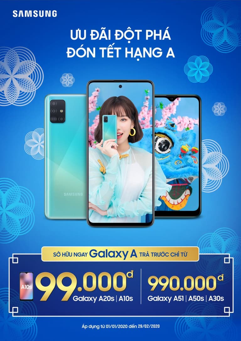 Cụ thể đối với Samsung A70, Samsung A51, Samsung A50s, Samsung A30s người dùng sẽ trả trước 990.000đ để sở hữu sản phẩm.Còn với Samsung A20s, Samsung A10s bạn chỉ cần trả trước 99.000đ. Samsung sẽ hỗ trợ khách hàng mua trả góp sản phẩm lãi suất 0% với mục đích người dùng có thể thoải mái trải nghiệm điện thoại chất lượng cao ngay trong mùa Tết mà không còn lo lắng về giá cả.