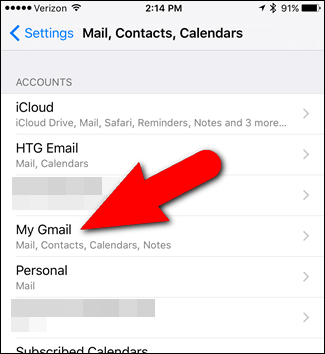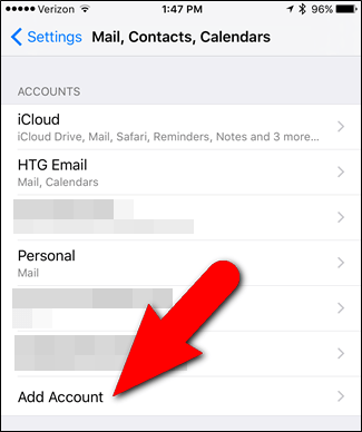 Trong Mail, Contacts, Calendar bạn sẽ thấy toàn bộ tài khoản đang được thêm vào trong máy của mình. Để thêm tài khoản Google, bạn chọn Add Account.