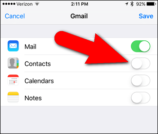 Màn hình Gmail sẽ hiển thị các tùy chọn bạn có thể đồng bộ với iOS. Như bạn thấy bạn có thể tùy chọn đồng bộ Mail, Contacts, Calendars và Note. Dữ liệu sẽ được đồng bộ vào trong các ứng dụng có sẵn của Apple. Nếu bạn có ý định sử dụng các ý định chính thức của Google thì bạn có thể chỉ chọn đồng bộ danh bạ.