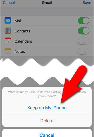 Để đồng bộ danh bạ, bạn chỉ cần kéo thanh trượt sang trạng thái màu xanh. Trong trường hợp bạn đã thêm sẵn danh bạ vào máy của mình, máy sẽ hỏi bạn có muốn giữ các danh bạ cũ hay không hay xóa chúng đi. Để chọn giữ danh bạ, bạn chọn Keep on My iPhone. Nếu có danh bạ trùng, bạn sẽ phải tự xóa thủ công.
