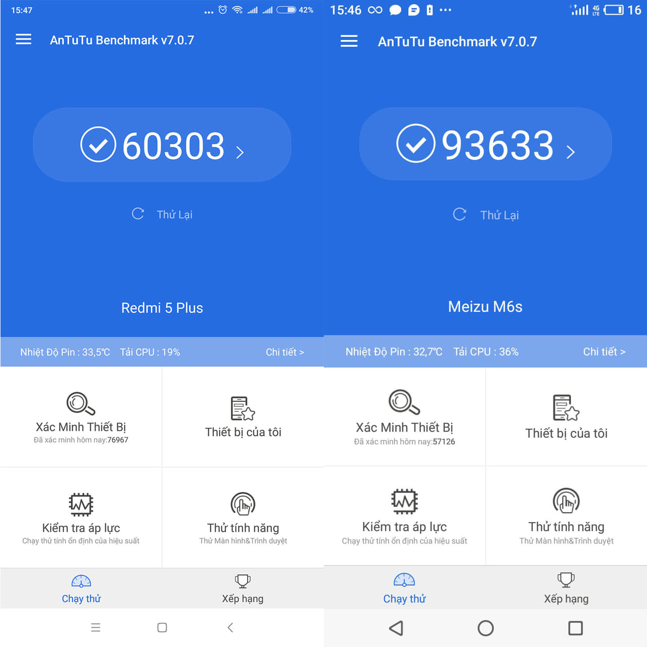 Chúng ta có thể thấy thông số trên 2 thiết bị thì Meizu M6s có điểm antutu hơn khá nhiều