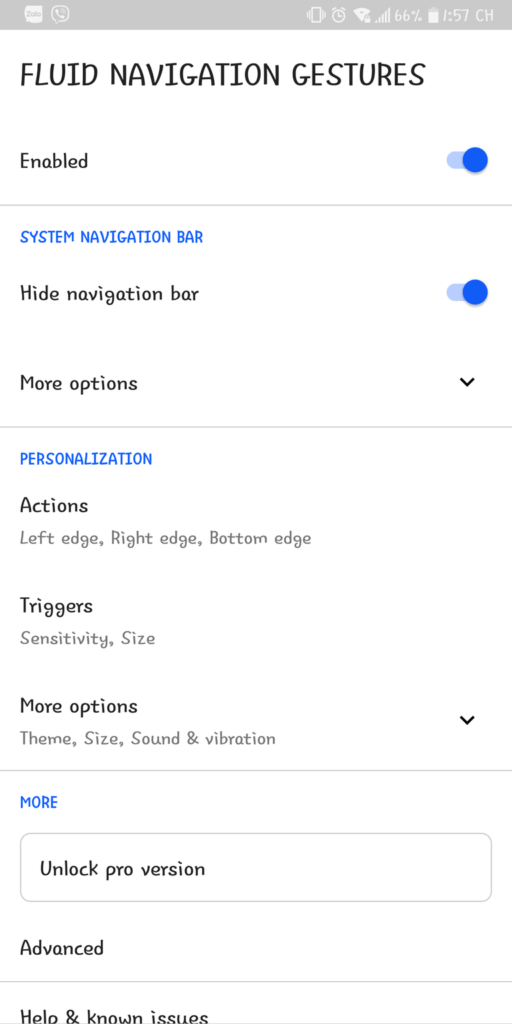 More Options, các tùy chỉnh khác về giao diện, màu sắc phản hồi, độ rung và âm thanh khi phản hồi , riêng phần giao diện ( theme ) phải mua bản PRO mới sử dụng được.