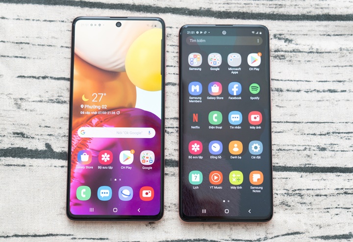 Mặc dù có kích thước lớn hơn, Galaxy A71 lại mỏng và nhẹ hơn A51 với kích thước 163,6 x 76 x 7,7 mm; 179 gram ở A71 và 162,5 x 75,6 x 8,1 mm; 186 gram ở Galaxy A51.