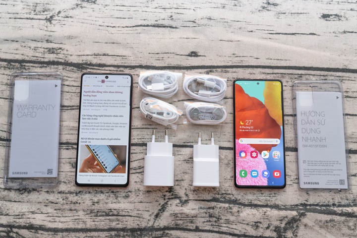 Phụ kiện kèm theo gồm củ sạc nhanh, cáp USB C, tai nghe, case bảo vệ và sách hướng dẫn. Trên Galaxy A71 là sạc nhanh 25W còn A51 là sạc nhanh 15W.