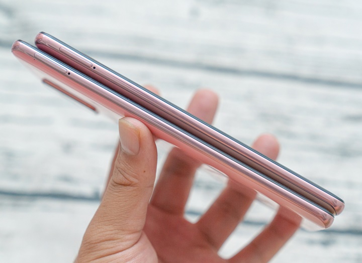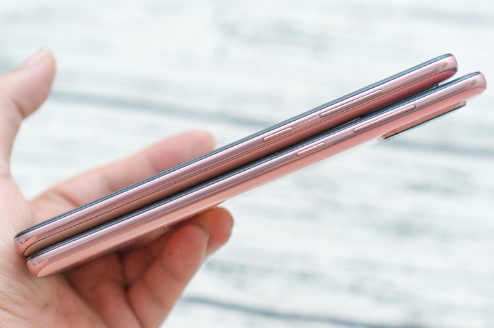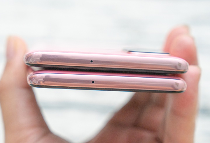 Bản màu hồng của Galaxy A51 có hiệu ứng chuyển dần sang màu cam theo góc nhìn, trong khi trên Galaxy A71 là hiệu ứng chuyển màu từ đậm sang nhạt.