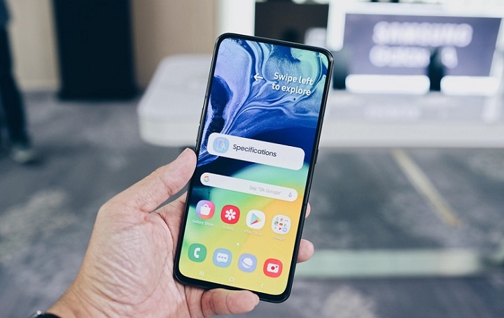 Galaxy A80 có màn hình 6,7 inch, độ phân giải Full HD+, sử dụng tấm nền Super AMOLED. Cấu hình của máy bao gồm chip Snapdragon 730G, RAM 8 GB và bộ nhớ 128 GB. Model này được trang bị cảm biến vân tay dưới màn hình, viên pin 3.700 mAh, tích hợp sạc nhanh 25 W.
