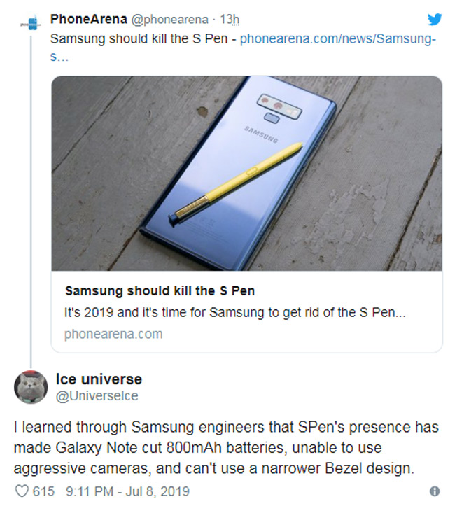 Mới đây, Tài khoản Twitter – Ice Universe (chuyên đưa ra nhiều dự báo công nghệ) cho hay đã có cơ hội trao đổi với các kỹ sư của Samsung. Những người này đã đề cập tới việc Samsung đã hy sinh không ít cho bút cảm ứng S Pen: