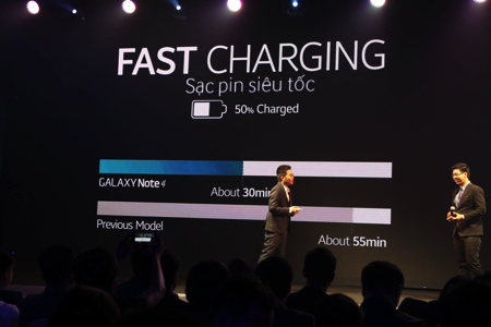 Đây là một điểm cộng rất lớn của người dùng dành cho Note 4, nhờ tính năng sạc pin nhanh là Adaptive Fast Charging với khoảng thời gian 30 phút cho 50 % dung lượng pin quả thực là một công nghệ hữu ích. Đây cũng chính là điểm cộng cho máy khi Note sở hữu viên pin có dung lượng lên tới 3.220 mAh và tất nhiên, để có thể sử dụng hiệu quả tính năng này, Samsung khuyến cáo người sử dụng nên sử dụng bộ sạc đi theo máy.
