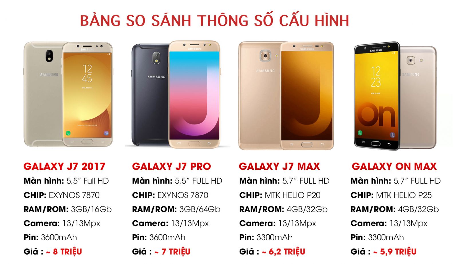 Qua bảng so sánh về thông số cấu hình của Galaxy On Max so với những anh em cùng nhà Samsung như J7 Pro, J7 2016 hay J7 Max thì chúng ta có thể thấy rằng sản phẩm này tuy dung lượng pin bé hơn chút so với 3600mAh của J7 2016 và J7 Pro nhưng nắm trong tay màn hình lớn hơn 5,7”cho trải nghiệm sướng mắt hơn cùng dung lượng Ram 4Gb đa nhiệm tốt hơn. Còn với người anh song sinh J7 Max thì On Max với chip Helio P25, là bản nâng cấp của chip Helio P20 với xung nhịp 2,5Ghz nhỉnh hơn so với 2,3Ghz trên J7 Max , cho khả năng xử lý đồ họa tốt hơn đồng thời cũng tiết kiệm năng lượng hơn.