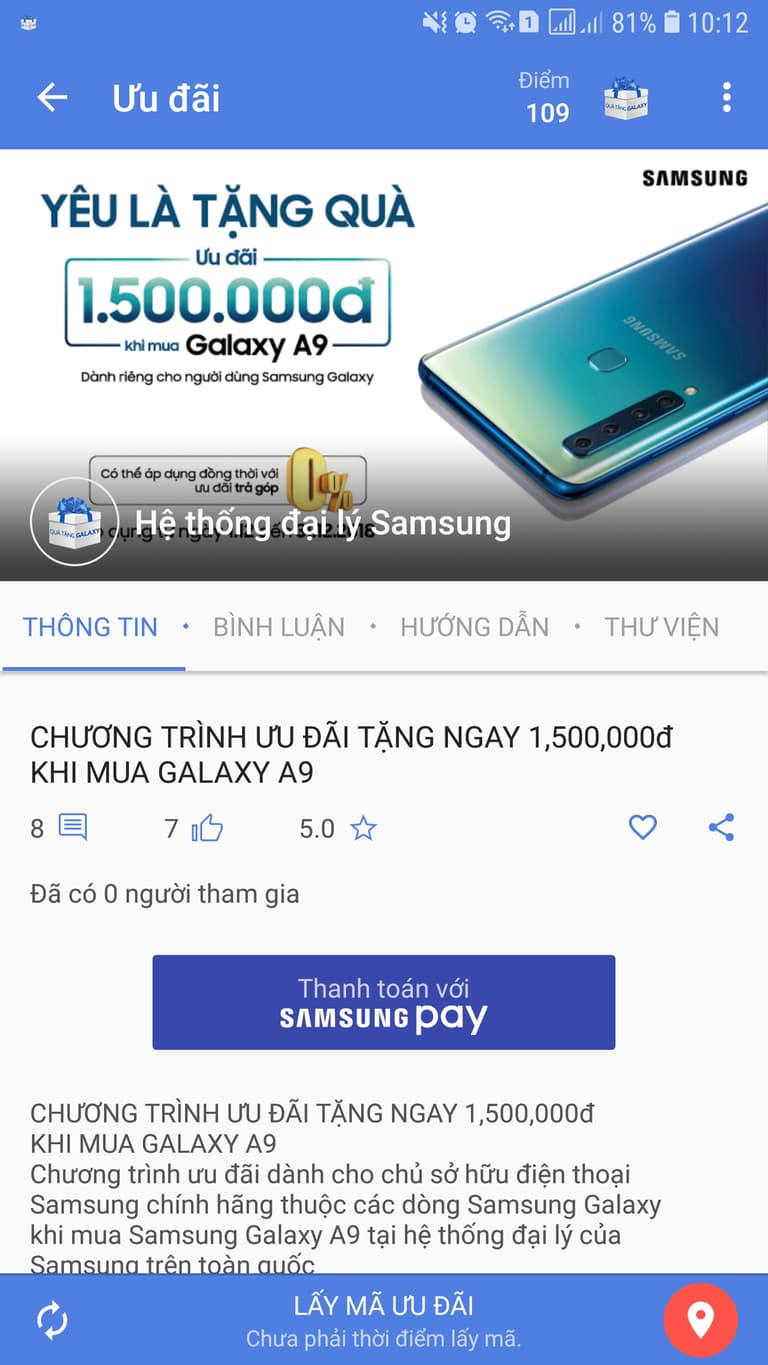 Sau chương trình đặt hàng, từ 1/12 – 31/12 khi mua Galaxy A9 2018 tại Di Động Thông Minh, các bạn sẽ được giảm thêm 1.500.000đ từ Galaxy Gift. Như vậy, số tiền các bạn bỏ ra chỉ là 10.990.000đ mà thôi.