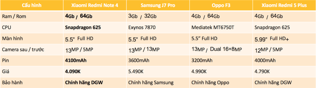 Với thiết kế nguyên khối sang trọng, chạy chip Snapdragon 625 mạnh mẽ, thách thức mọi game khủng nhất hiện nay, bộ nhớ Ram lên tới 4Gb, bộ nhớ lưu trữ thoải mái lên tới 64Gb và viên Pin 4100mAh siêu trâu,… Xiaomi Redmi Note 4 64Gb Ram 4Gb có đáng mua nhất trong tầm giá 4 triệu? Mời các bạn cùng xem bảng so sánh sau để có câu trả lời cho riêng mình nhé: