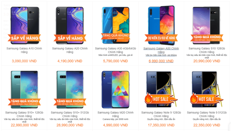 Không giống như các năm trước, Samsung năm nay đang tập trung đánh mạnh vào phân khúc điện thoại tầm trung, giá rẻ. Bằng chứng cho việc này là mới chỉ 3 tháng đầu năm, Samsung đã phủ hết các phân khúc điện thoại từ 2 cho đến 8 triệu đồng với các mẫu như Galaxy J2, J4 Core, Galaxy A20, A30, A40, A50,… Để giúp người dùng tiết kiếm tối đa ngân sách, Di Động Thông Minh sẽ triển khai chương trình giờ vàng mua điện thoại Samsung giá rẻ vô cùng hấp dẫn.